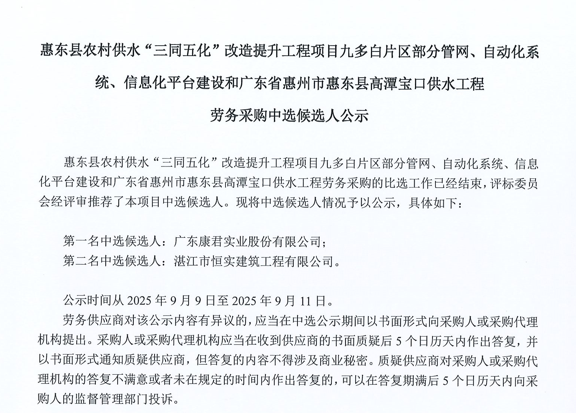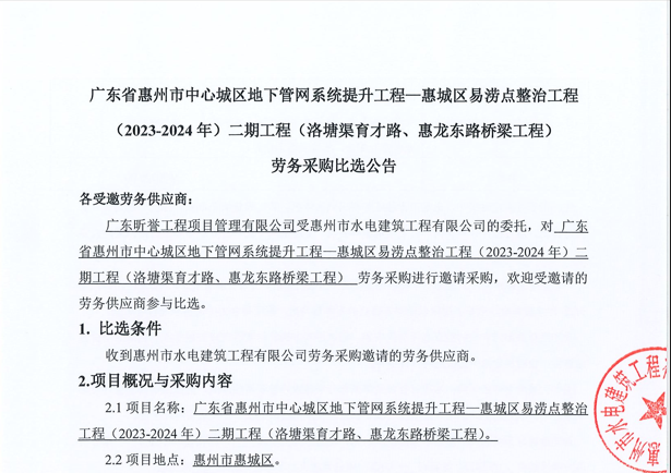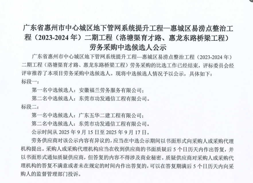廣東省惠州市中心城區地下管網系統提升工程-內街小巷排水管網病害修復及錯混接改造項目一期施工勞務采購(第二次)中選候選人公示……